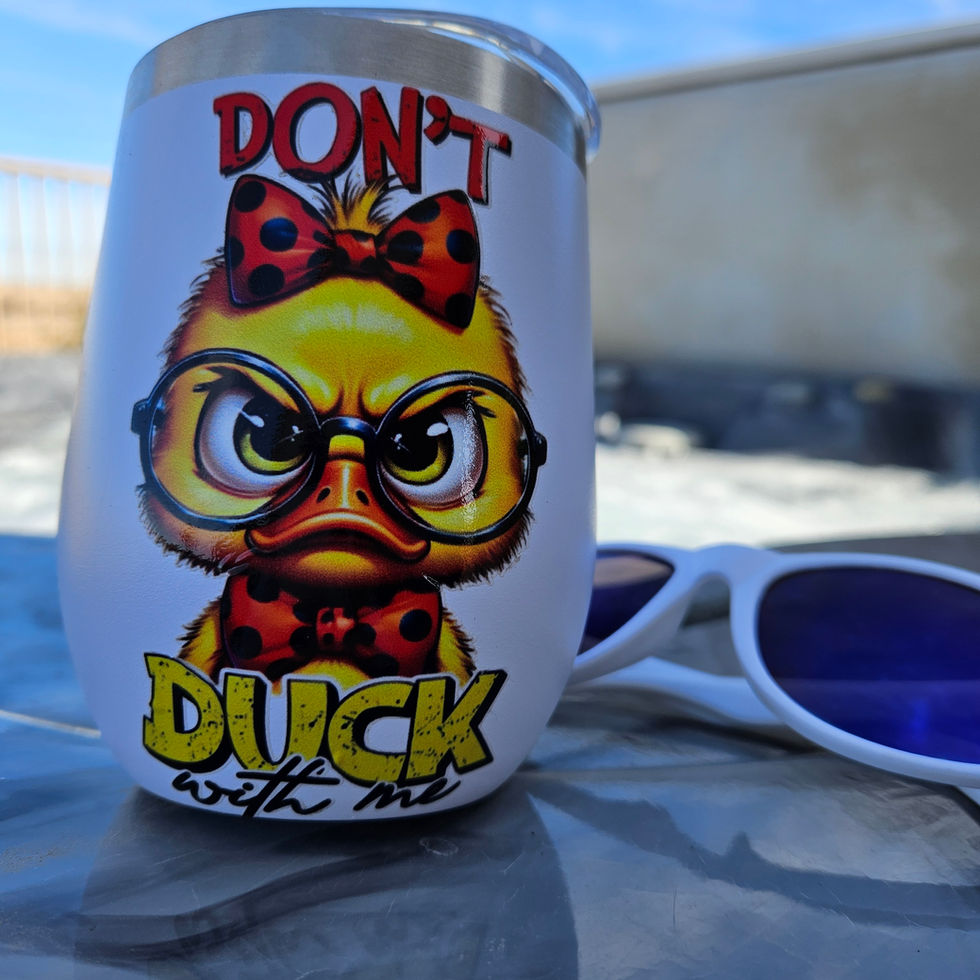 Discover a new level of fun with the "Don't Duck With ME!" wine tumbler. This cheeky yet durable tumbler adds a playful twist to your evening drink, embodying our values of quality and unique style. Perfect for a night in or social gatherings, it keeps your wine perfectly chilled. Pop by Nostalgicnickies and grab this must-have addition to your kitchenware. Cheers to unforgettable moments!