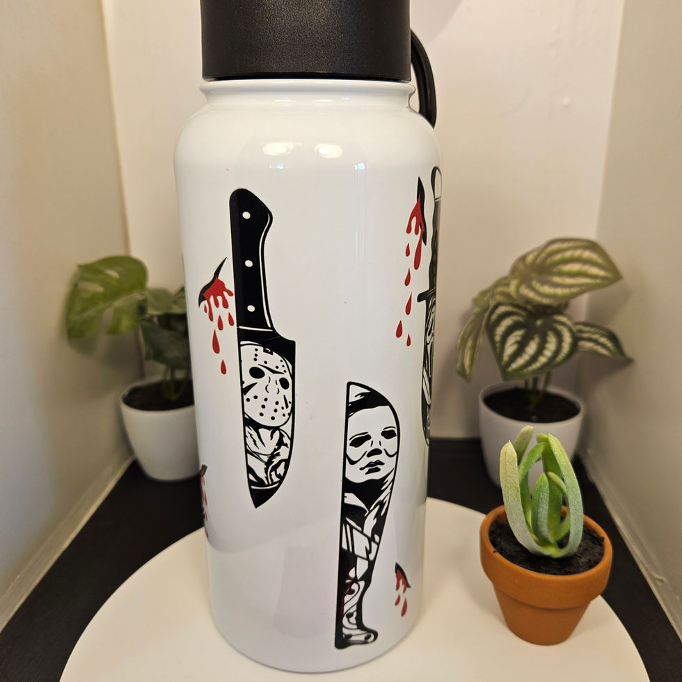 Stay hydrated in style with our 32 oz. Scary Movie Themed Water Bottle. This eco-friendly vessel merges sustainability with a touch of spooky nostalgia, making it perfect for Halloween enthusiasts. Crafted for durability and adorned with iconic horror motifs, it's the ideal accessory for both everyday use and festive occasions. Elevate your hydration game while celebrating your love for classic scary movies and supporting local businesses. Grab yours today and sip sustainably with flair!